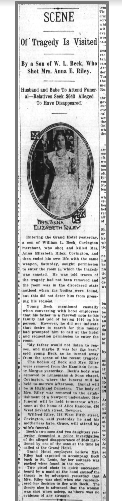 The scandal: my grandmother, Anna Nix Riley, was killed by an older man known to the family, William Beck, who had fallen in love with her. Quite possibly they had an affair. My grandparents lived in Covington, Kentucky, and Anna took the trolley to the Grand Hotel in Cincinnati to meet Mr. Beck where she told him that she would not leave her husband and go to St. Louis with him. She had her eight-month old infant, Grace with her.